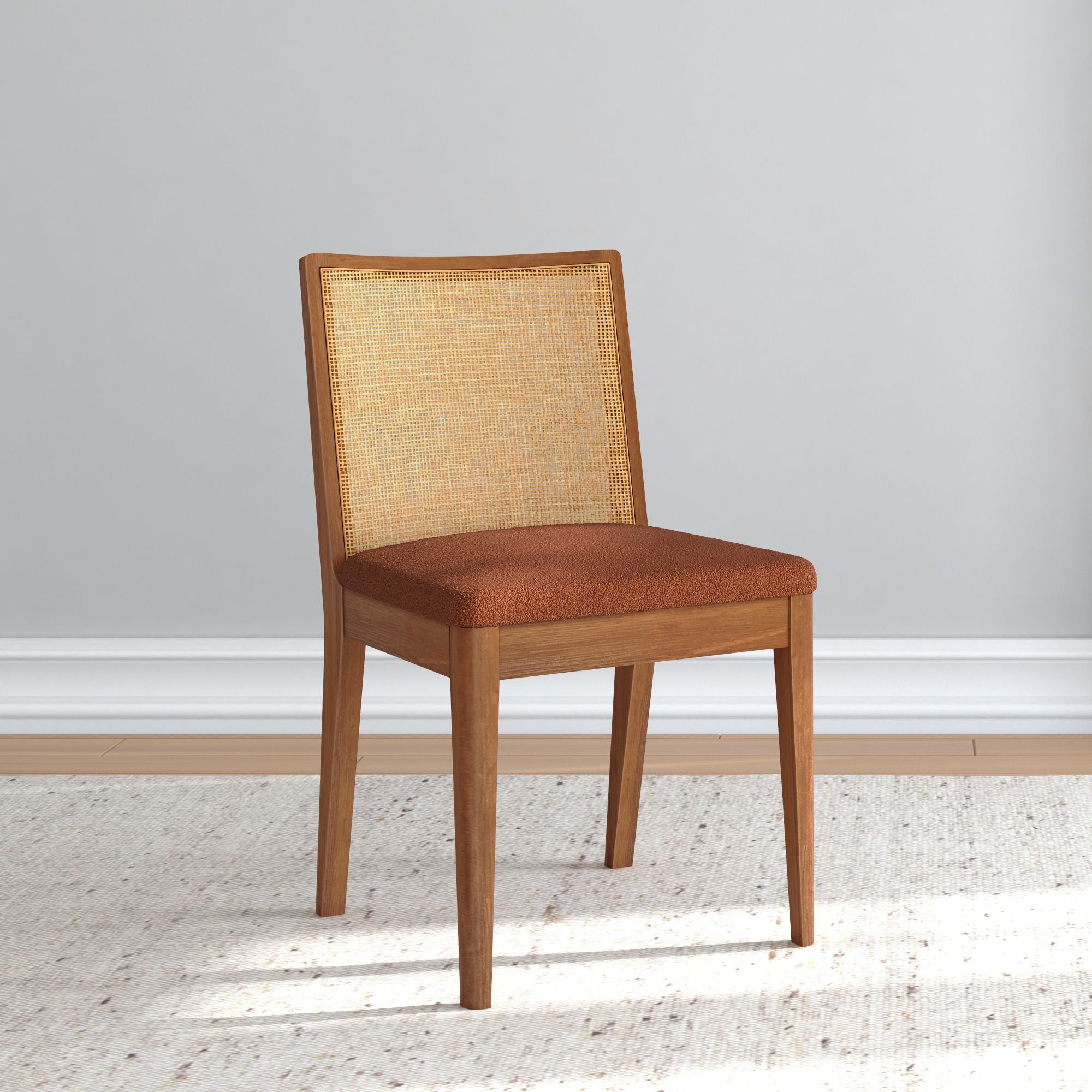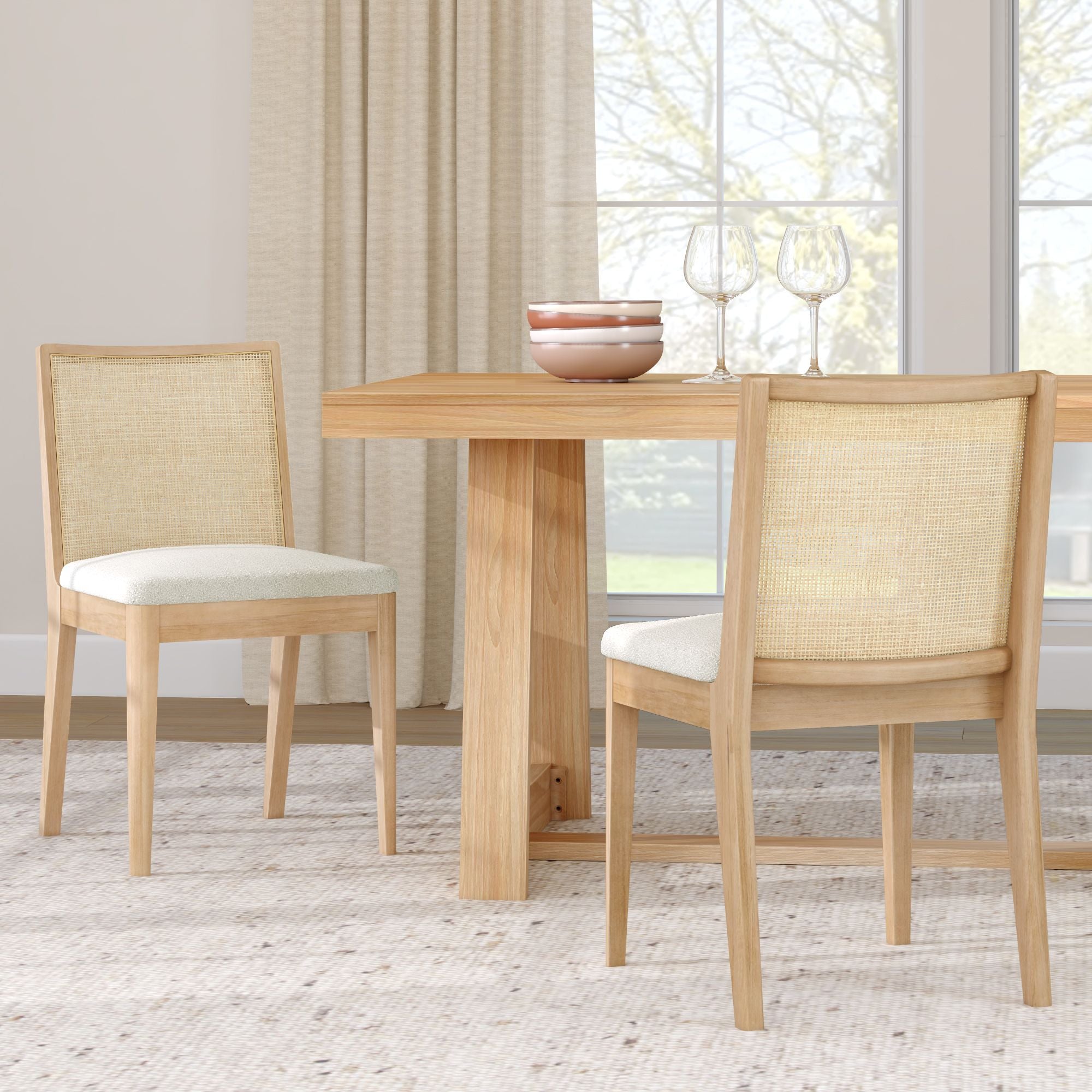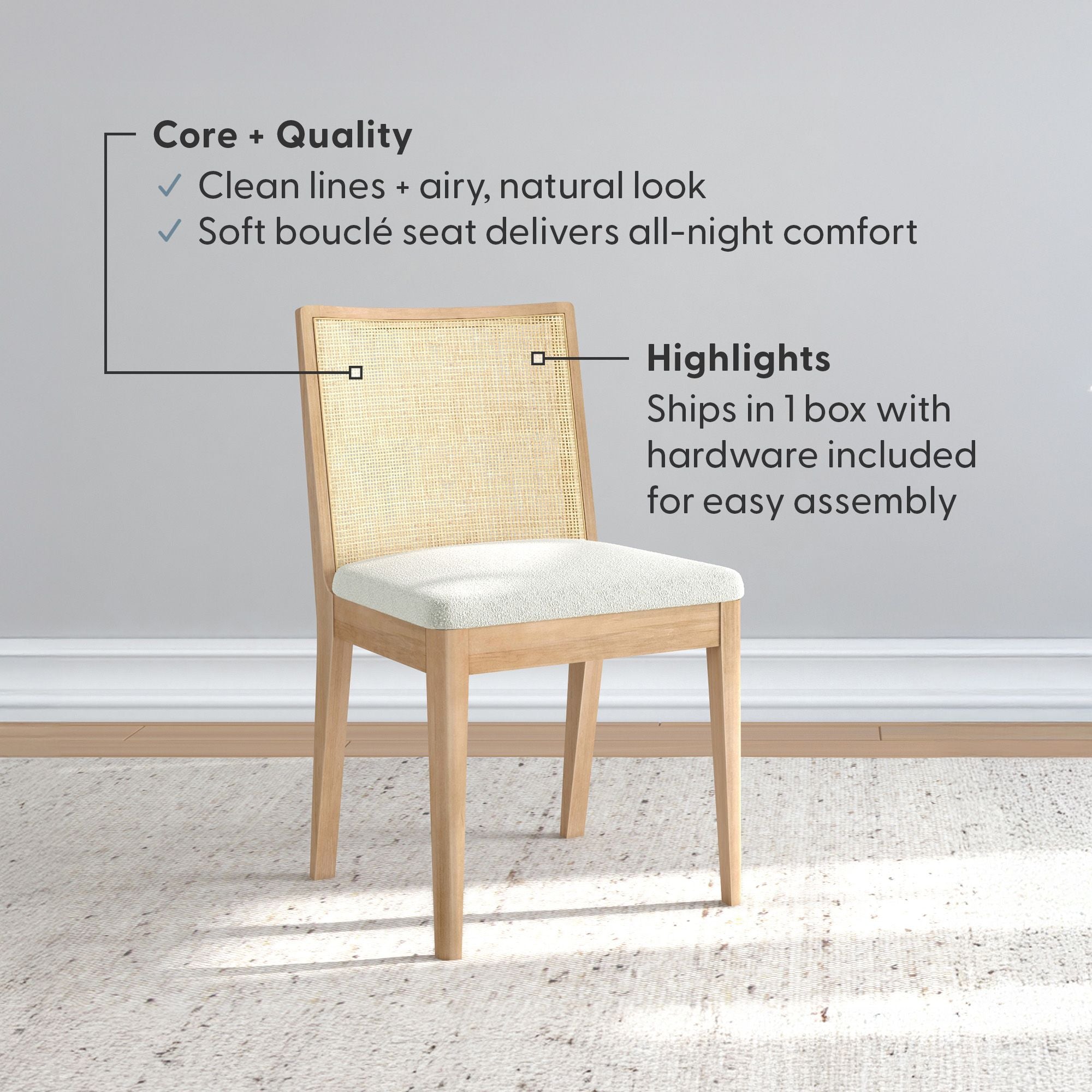 The Elio Dining Chair has a look you’ll love and a seat you won’t want to leave. Built with a sturdy frame made of solid rubberwood and engineered wood, it’s designed to keep up with everyday life (and then some). The rattan backrest brings in that natural, airy texture that instantly makes your space feel more relaxed. Add in the soft bouclé cushion and you’ve got comfort that goes way beyond dinner. Whether your vibe leans mid-century, boho, or coastal, Elio’s clean lines and airy feel make it a standout pick. Available solo or in sets of 2 and 4, this rattan and bouclé dining chair is easy to mix, match, and make your dining space feel your own.