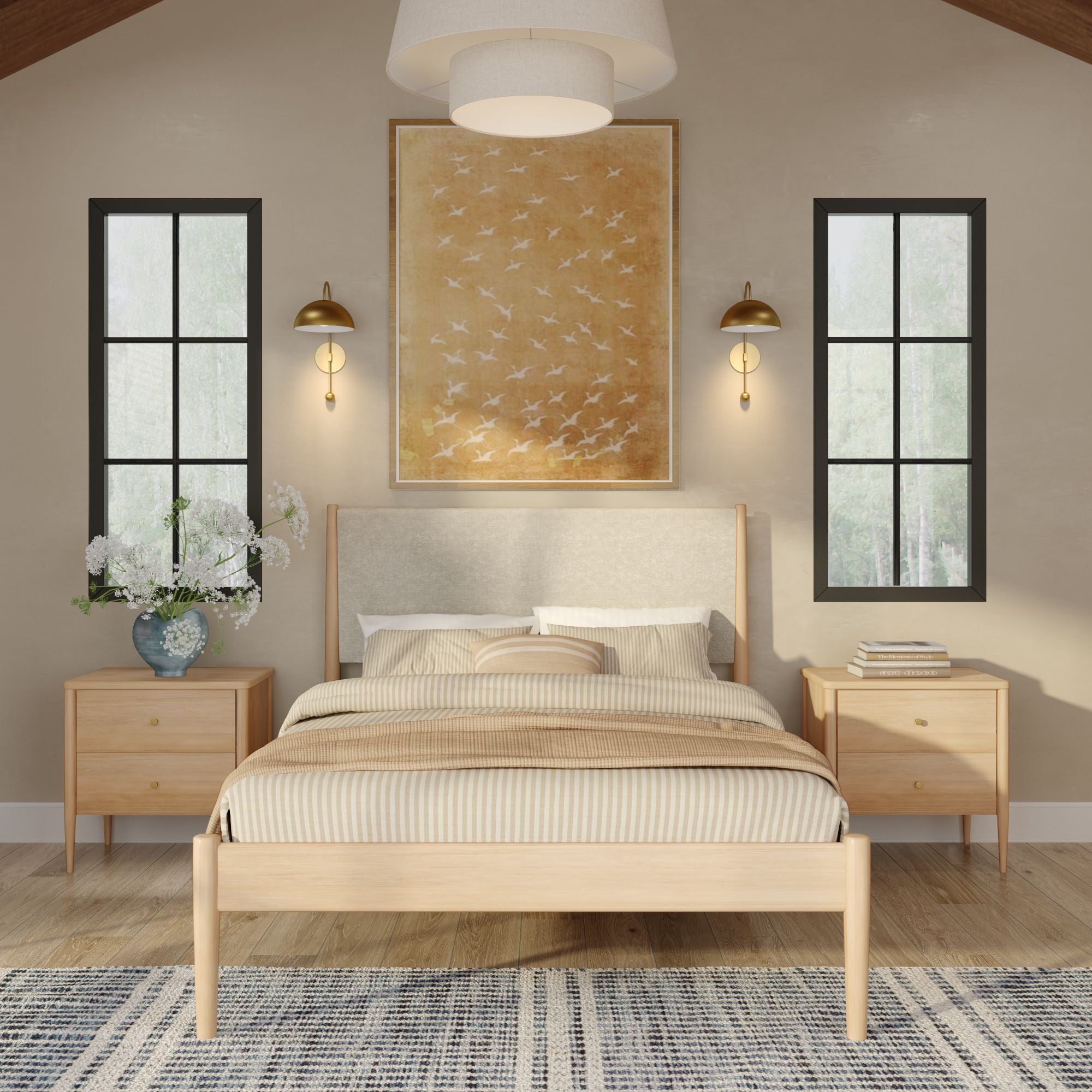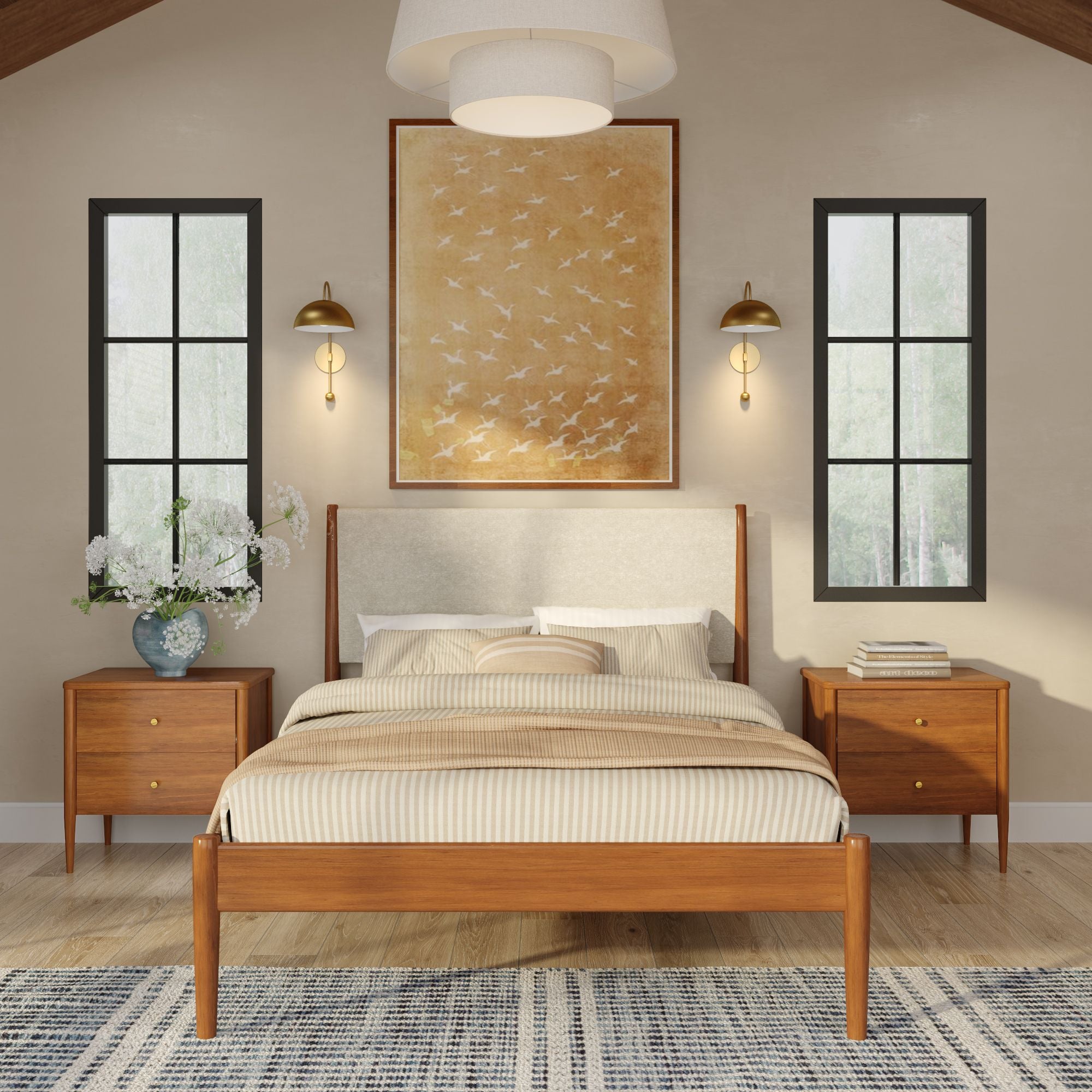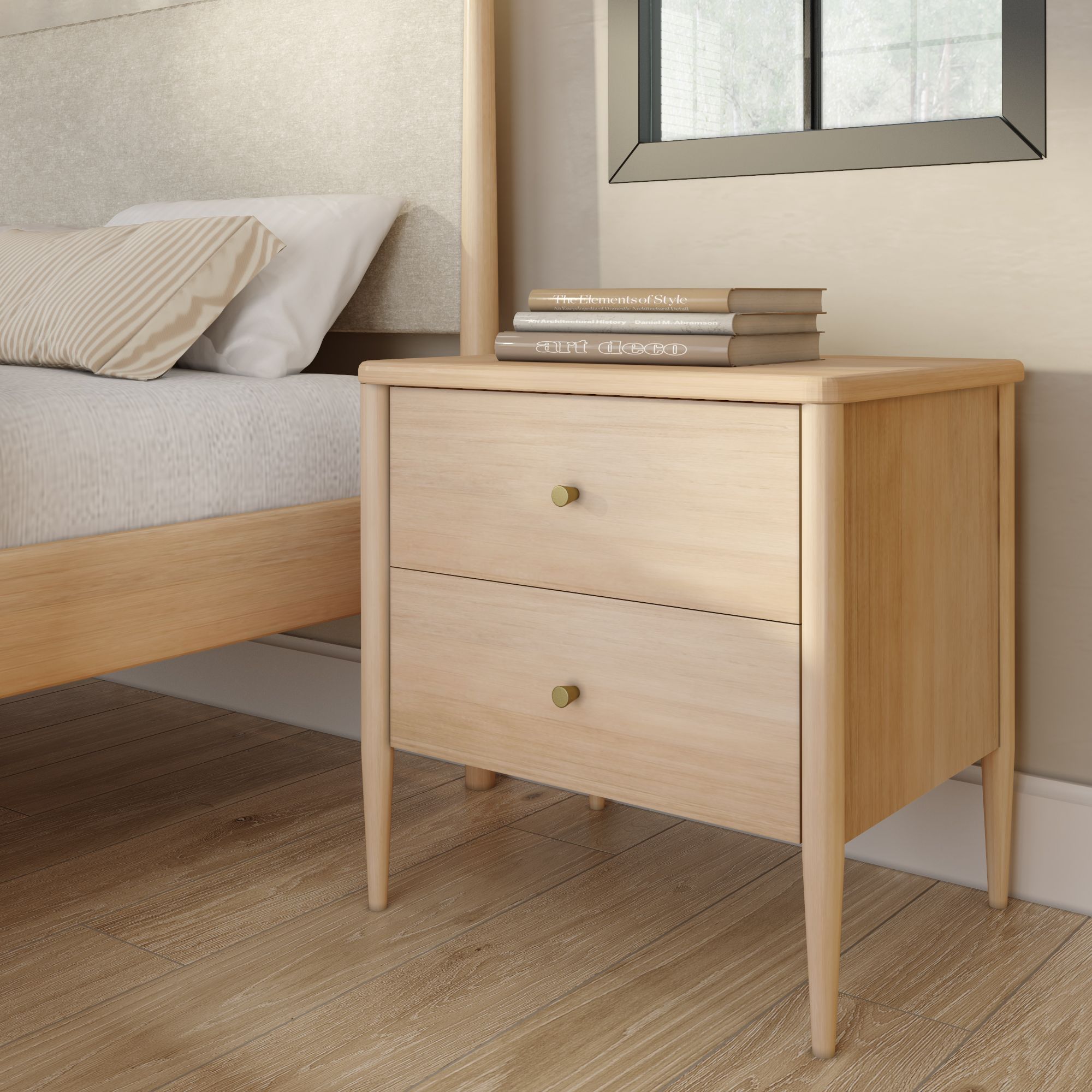 The Harbor 2-Drawer Nightstand brings mid-century charm straight to your bedside. Made from solid pine and engineered wood, this mid-century modern nightstand is built to last while letting the natural beauty of real wood shine through. Two spacious drawers keep your essentials tucked away, finished with antique brass pulls that add just the right touch of modern shine. Rounded, tapered legs ground the design with that iconic mid-century look. The result? A nightstand that’s functional, stylish, and easy to work into any bedroom setup.