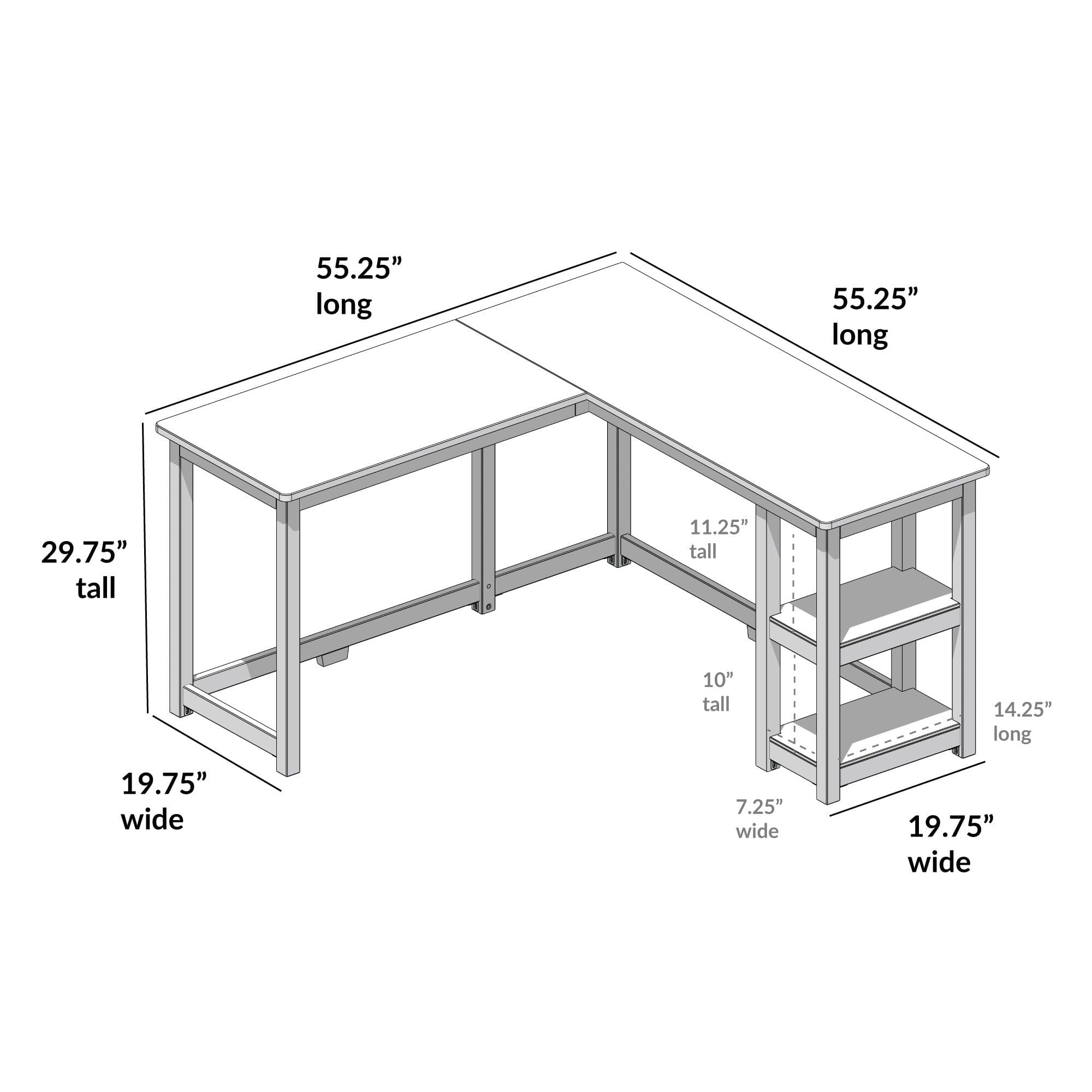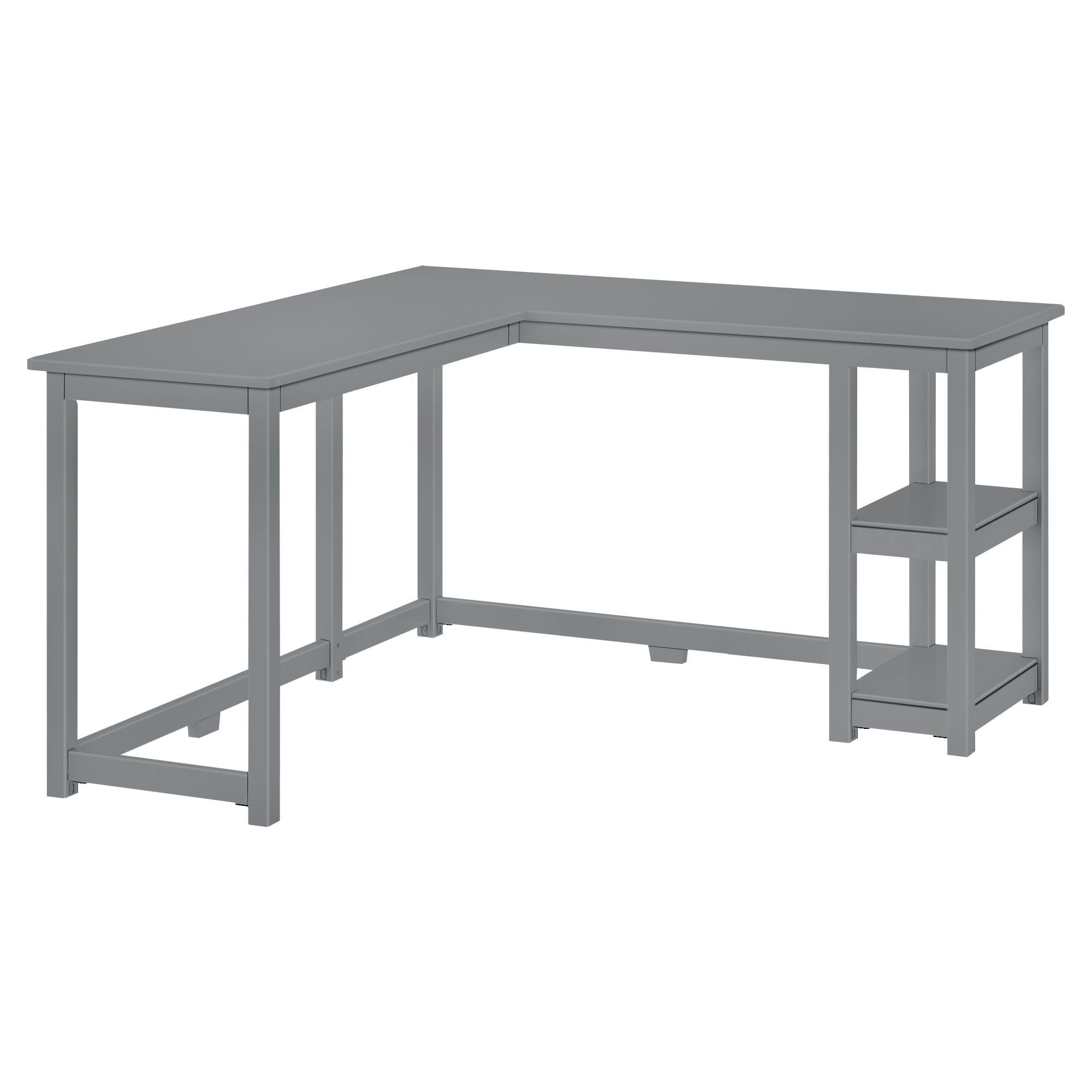Maximize your workspace with our Corner Desk with Shelves. A modern take on a classic style, this wood desk combines clean lines and beautiful neutral finishes for a look that is both sleek and stylish. An engineered wood tabletop and shelves and knot-free, solid wood legs add superior strength and durability, while non-toxic finishes contribute to a clean and healthy home. Flush, color-matched hardware and rounded edges give this desk a clean, modern look that compliments any home’s style. Two open shelves underneath the desk make it easy to organize and store all your essentials. Designed to fit neatly in a corner, this L-shaped desk is the perfect addition to your bedroom, office, or just about anywhere you need a reliable workspace.
